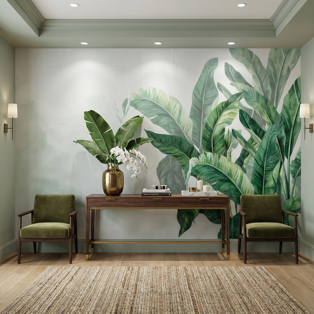 Doğal yeşil tonlarının yumuşak geçişlerle kullanıldığı bu tasarım, mekânı daha geniş ve ferah gösterir. Özellikle salon, yatak odası ve çalışma alanlarında güçlü bir odak duvar oluşturmak isteyenler için ideal bir tercihtir. Modern, botanik ve minimal dekorasyon stilleriyle kusursuz uyum sağlar.